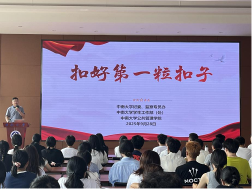 为深入学习贯彻中央八项规定精神,落实新时代学校思想政治教育要求,引导新生筑牢廉洁自律思想根基,9月28日上午9时,公共管理学院在潇湘校区毓秀楼238举办“扣好第一粒扣子”新生廉洁教育专题宣讲。会议由学院党委副书记耿贵斌主讲,2025级全体本科新生参加。