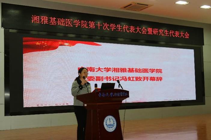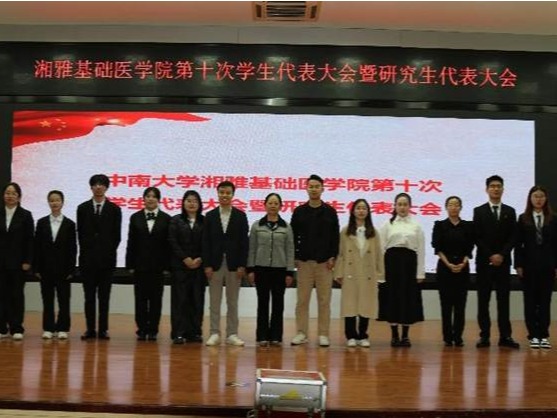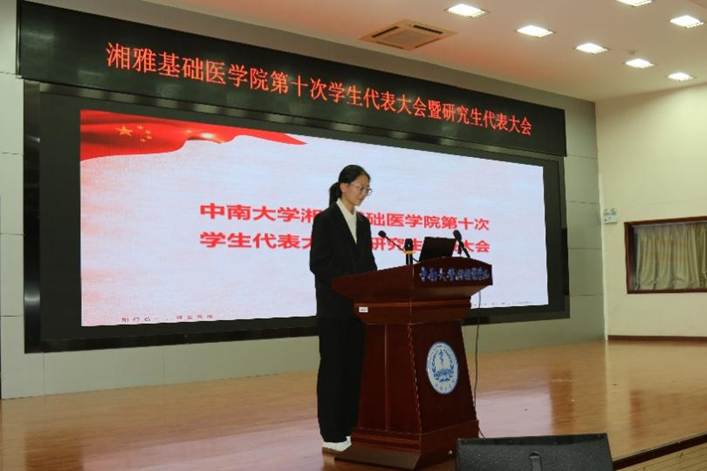 10月19日下午,中南大学湘雅基础医学院第十次学生代表大会暨研究生代表大会在杏林校区图书馆报告厅顺利召开。中南大学湘雅基础医学院党委副书记冯虹、学院学工办主任胡名益、学院团委书记周正、学院学工办刘莹莹及吴忆婷老师参加,会议由基医拔尖2401班崔舒同学主持。