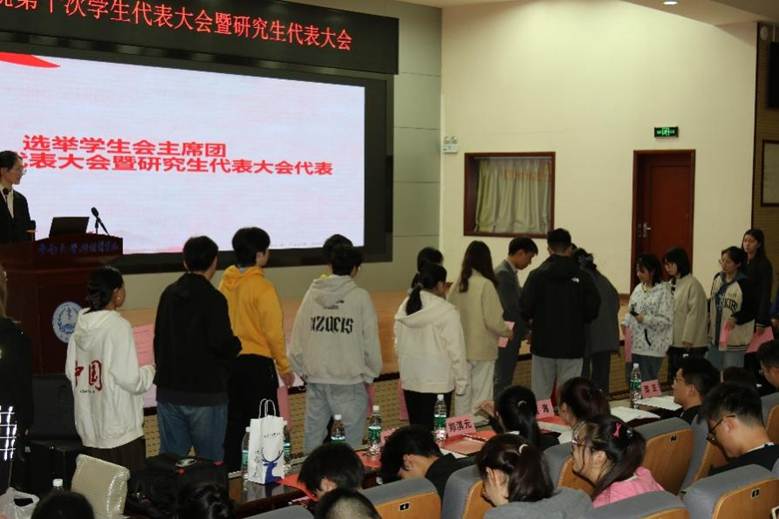 在宣读中南大学湘雅基础医学院第十届学生会主席团、研究生会主席团候选人简介、第十次学生代表大会暨研究生代表大会代表候选人简介后,经代表庄重投票,会议选举出陈梦禹、刘红梅、肖腾为学院第十届学生会主席团成员,黄倩倩、龙扬、肖雨妍为学院第十届研究生会主席团成员。