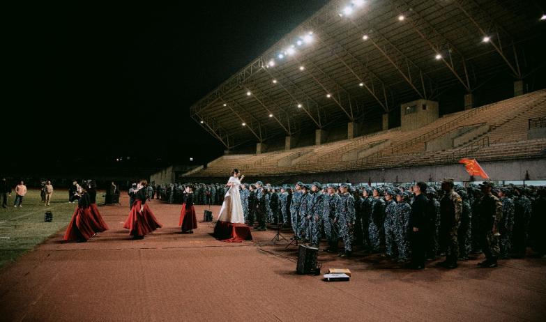 现场灯光照在外语院2025级新生们稚嫩的脸庞上,但他们眼神坚定,歌声动人。体育场上红旗飞扬,舒展开的是外语院新生们对祖国最真挚的情感画卷;聚光灯下表演者们舞态生风,跃动起的是外语院新生们对祖国最美好的祝福乐章。同时,外国语学院党委副书记孙胜和2025级本科生辅导员李雅丽也陪伴着新生,迎着徐徐晚风,歌唱出对祖国诚挚的热爱。