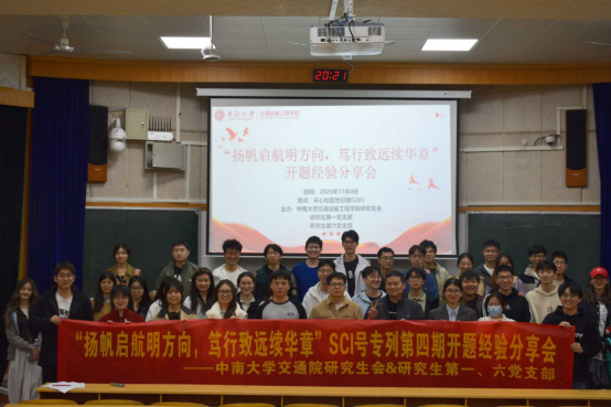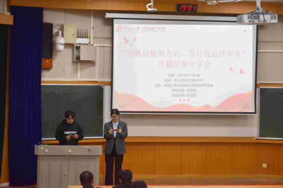 为进一步浓厚科研氛围,激发交院学子投身交通强国建设的使命感与责任感, 11月4日19:00,由中南大学交通运输工程学院研究生会联合研究生第一、第六党支部共同举办的第四届“扬帆启航明方向,笃行致远续华章”开题经验分享会在天心校区世纪楼D201顺利举行。活动邀请了2023级硕士刘佳齐、黄海洋和禹霖三位优秀同志担任主讲嘉宾,以饱满的热情和丰富的科研经验为同学们拓展开题思路、答疑解惑,吸引全院130余名研究生积极参与。