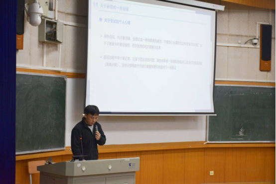 最后,研究生第三党支部的禹霖同志围绕开题报告构架的撰写与秋招面试经验进行了深入分享。禹霖同志提到,开题报告不是闭门造车,需与团队和导师进行深入沟通,以确保研究方向科学合理。同时他建议同学们在求职前,通过课题组、学校宣讲会及企业官网等多种渠道深入了解目标企业。