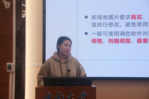 最后,信息部副部长王铭晗就新闻摄影作了专题分享。她讲解了摄影构图、光线与时机三大要素,通过优秀实例展示了实用拍摄技巧,并对图片后期处理提出了规范化要求。