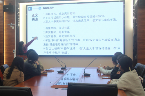 然后,信息部部长李梦媛对新闻稿写作与投稿流程进行了系统讲解。她详细介绍了新闻写作的基本规范、官方投稿平台的使用方法以及相关的激励机制,为同学们提供了清晰的操作指南。