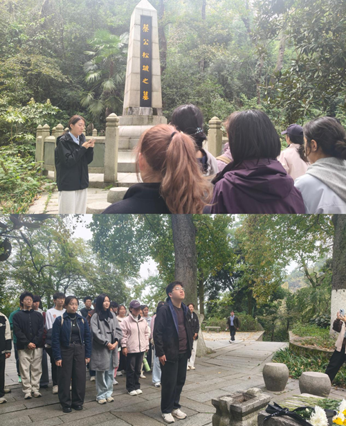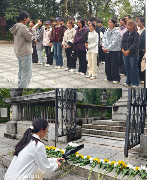 同学们继续前行至蔡锷墓。化生环2503黎雅欣同学聚焦“护国讨袁、捍卫共和”的历史,讲解了蔡锷将军“为四万万人争人格”的英雄壮举。在庄严肃穆的氛围中,团员代表周嵩敬献白花,全体鞠躬致敬。化工2404班刘辰川同学在感悟分享中表示“被两位烈士在面对外敌入侵时,不求保全自身,而只图民族复兴的这种无私无畏的精神深深打动。我们应将先辈的精神动力转化为我们研究学习的动力。”
