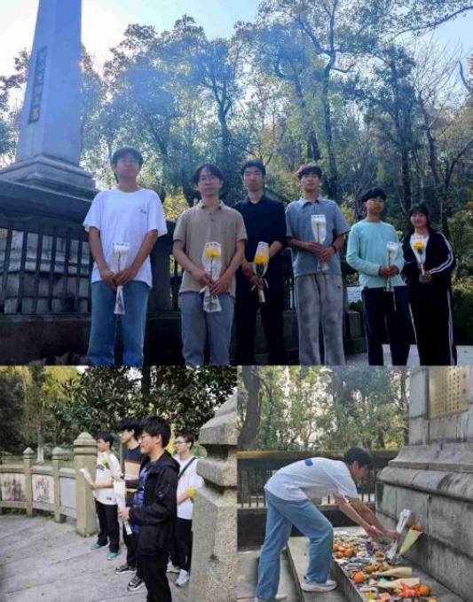 蔡锷墓前,同学们持白菊列队肃立,依次献花鞠躬,追思其 “为四万万人争人格” 的护国担当;长沙会战纪念碑前,大家凝视阵亡将士名录,指尖轻触石碑,感受军民浴血抗敌的斗志,现场肃穆无声;黄兴墓前,学子有序献花默哀,深切缅怀这位辛亥革命先驱。默哀后,同学们互相分享感悟,立志将爱国情转化为学习动力,践行青年使命。