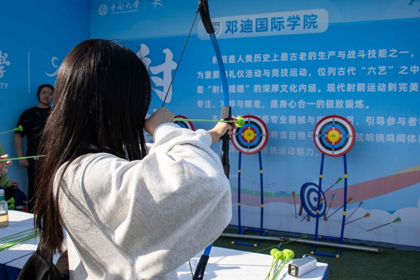 11月22日,第二届中南大学大学生体育文化节在潇湘校区体育场副场正式拉开帷幕。由邓迪国际学院承办的“射箭”展区成为全场焦点,以其独特魅力吸引了众多师生驻足体验。