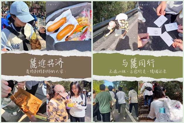 上午十点,两支队伍分路线同步出发。临五2403团支部体验“正念行走”,聆听风声、感受阳光,重建与自然的联结,同时开展"清风随手拾",以朴素行动守护山色;临八2402团支部则挑战陡峭山路,通过“情绪签到卡”记录心境、获取心理调适,实现身心同步释放。沿途自发的能量补给与路况提醒,织就了友爱同行的温暖画卷。