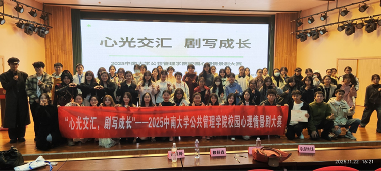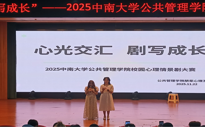 11月22日下午2时,由公共管理学院朋辈心理互助会主办的“心光交汇,剧写成长”校园心理情景剧大赛,在潇湘校区毓秀楼和声堂举顺利行并圆满落幕。学院心理专干梁慧、心助会会长赖舒垚、副会长谭铱婷和校心联干事陈妮娜出席并担任本次评委。本次活动共八支队伍参赛,龚琬乔、向雨轩担任主持,全体心助会成员积极参与组织与服务。