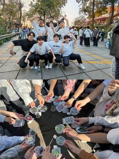 各团支部登顶后,纷纷开展“多人+作品”集体合照创作。同学们或手持秋叶书签围成同心圆,或举着拼贴作品排列出“公卫”字样,让五彩秋叶与创意作品成为合影的独特背景。活动全程氛围热烈融洽,登山时,体力好的同学主动帮扶同伴、分享补给;创作中,大家围坐讨论、分工协作,剪叶、拼贴、固定各司其职,在欢声笑语中深化了彼此情谊,充分感受集体活动的温暖与乐趣。