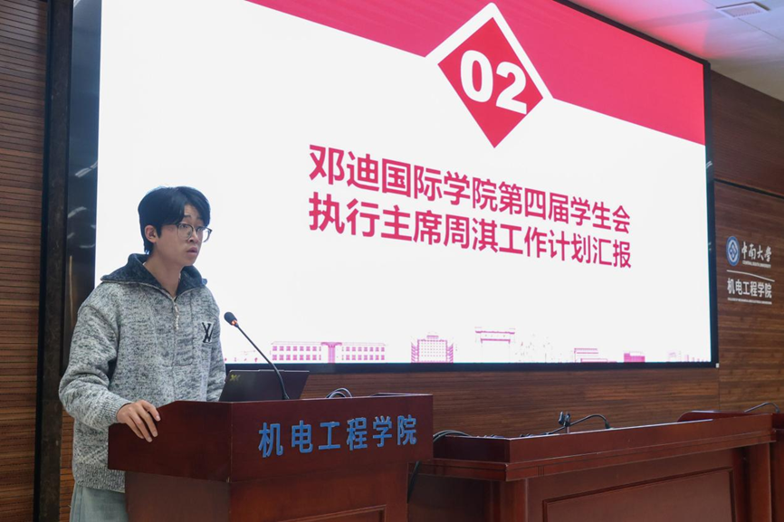 大会在庄严的氛围中拉开帷幕。第三届学生会执行主席周周作任期工作总结,其回顾了过去一年“团学新心”各部门在服务同学、促进学院文化建设等方面取得的成果,并对全体成员的辛勤付出表示肯定。随后,第四届学生会执行主席周淇代表新一届团委学生会作工作展望。他提到,新一届学生会将围绕三个方面开展工作:一是坚守服务初心,提升服务质效,做同学信赖的“贴心人”;二是强化组织建设,凝聚团队力量,打造高效协作的“战斗集体”;三是立足国际特色,创新活动形式,打造独具风格的“校园品牌”。