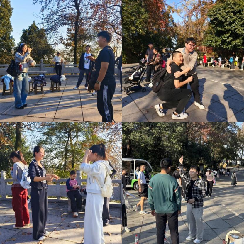 “三、二、一,茄子!”快门声此起彼伏,青春定格挑战成为最受欢迎的项目之一。参与队伍抽取的姿势卡花样百出——有元气满满的集体比耶,有默契十足的叠罗汉,还有搞怪可爱的“开花pose”。大家默契配合,精准复刻造型,稳稳保持3秒不动,将笑脸与岳麓山的红叶、蓝天一同存入相册,让秋光里的青春身影成为最珍贵的回忆。