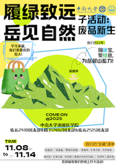 2025年11月15日上午,中南大学湘雅医学院临五2410、精卫2402、临五2515团支部在岳麓山上联合开展了一场“环保+登山”创新团日活动。在习近平生态文明思想的指引下,本次活动主题定为“履绿致远,岳见自然”,以聆听、追寻、传递岳麓山的绿色回声为主线,串联起环保教育的输入与输出。