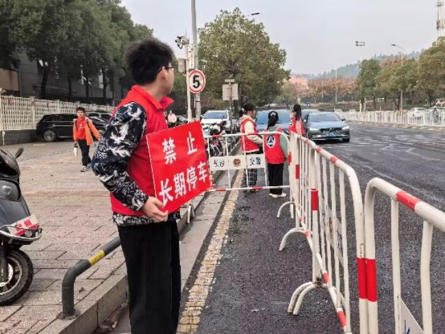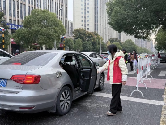 志愿活动于每日早高峰时段开展,现场交通秩序井然。志愿者分为两组展开工作,其中一组负责交通秩序劝导:志愿者手持标牌,提醒机动车即停即走;同时引导非机动车规范停放,保障道路畅通。针对临时停靠车辆,志愿者提供开关车门、搬运书包等贴心服务,进一步缓解车流压力。在志愿者们有序的引导下,学生们进校变得更加高效便利,他们纷纷向志愿者投去感激的目光,家长也对志愿者露出赞扬的微笑。