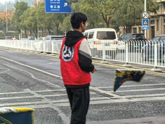 另一组志愿者则负责交通安全维护:他们分驻斑马线两侧及中央栏杆处,示意车辆礼让行人,待车辆完全停稳后引导行人有序通过,有效避免人车混行风险。志愿者们一边规范行人过马路,一边温柔安抚着急的学生。在志愿者们的耐心引导下,学生们不再慌乱着急,而是井然有序地跟随引导过马路。