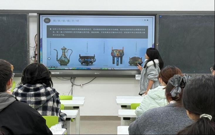活动伊始,汤敏洁同学为大家带来了系统生动的掐丝珐琅入门讲解。从这项被誉为“燕京八绝”之一的工艺历史讲起,阐述其从西域传入、于明清鼎盛的交融历程,重点解析了“临摹雏形、掐丝、点蓝、定型”四大核心制作流程,演示了从素胚到流光溢彩的艺术品的创作过程。