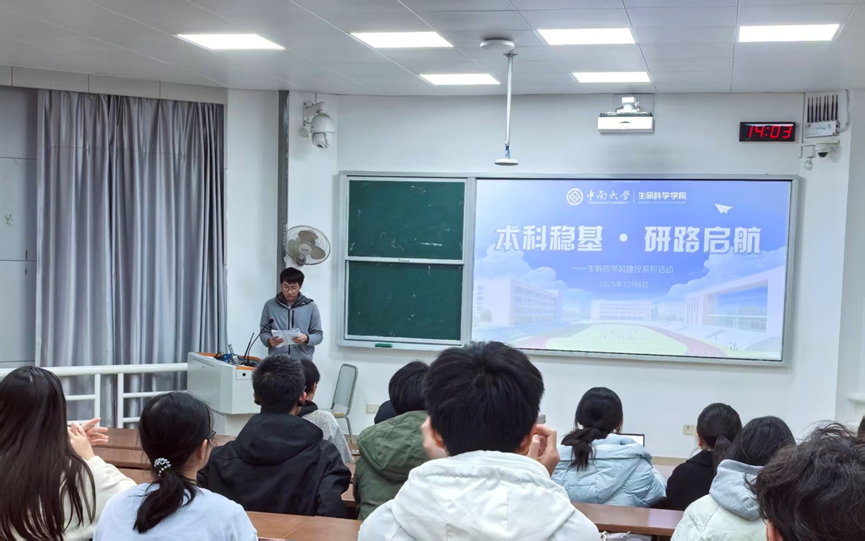 2025年12月6日下午,中南大学生命科学学院“本科稳基,研路启航”研究生经验分享会在杏林校区福庆楼T211教室成功举办。活动旨在满足本科生认知研究生阶段学习科研的需求,搭建学业规划与职业发展的交流平台,帮助同学们明晰深造路径。主题新颖实用,吸引了众多本科生参与。
