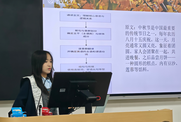 胡心怡同学以“全局策略”为主线,系统梳理了四级考试的分值分布与时间安排,并围绕听力、阅读、写作翻译三大模块展开实战技巧分享。在听力部分,她结合真题讲解“预判原则”“关键词陷阱识别”等方法;阅读方面则针对不同题型演示定位与比对技巧;写作翻译模块则提供了实用框架与常见主题积累建议。