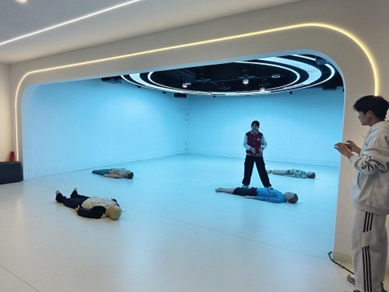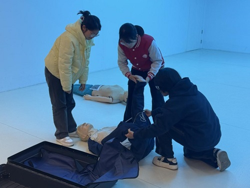 在实操教学环节,指导老师针对老年慢性病患者突发、群体性健康事件处置等典型场景,现场演示了CPR的操作流程与技术要点,并借助假人模型进行了分步教学。同学们随后分组开展CPR实操训练与VR应急场景模拟体验,在“学思践悟、知行合一”的浓厚氛围中,进一步提升了在突发事件中敢于担当、科学施救的意识和能力。