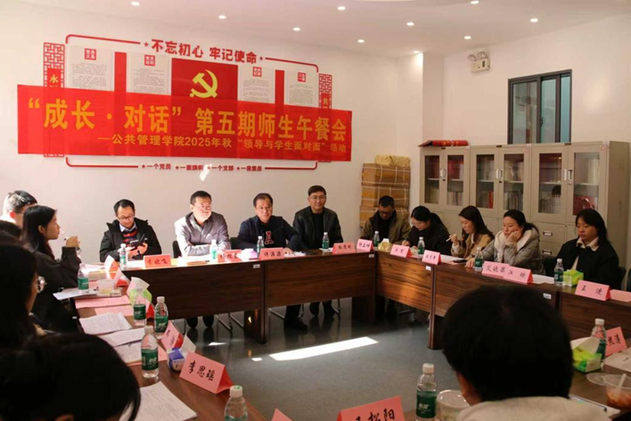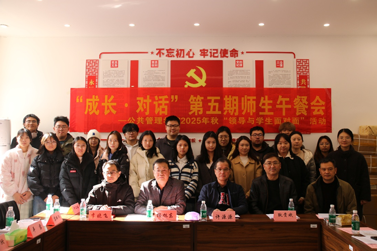 12月25日中午,公共管理学院第五期“成长·对话”领导与学生面对面午餐会在公管楼310党员活动室成功举行。学院党委书记杨旭东、院长许源源、副书记耿贵斌、副院长李晓飞以及学工办主任徐立坤、本科生辅导员梁慧、张宇奇,本科生教务办艾晓果、研究生教务办江珊、教学实验室王进、兼职辅导员胡霄涵等老师代表,与本科、硕士、博士阶段不同专业的12名学生代表共话成长。本次活动旨在通过面对面交流,广泛听取学生心声,畅通师生交流渠道,切实回应学生诉求,凝聚育人合力。