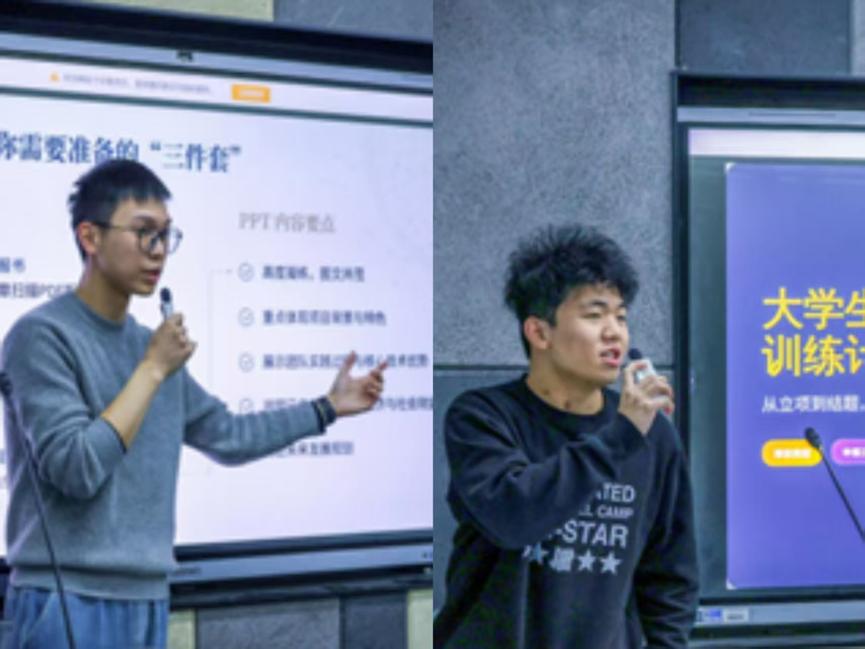 本次分享会特邀我院22级优秀学生颜思宇、陈烨担任主讲。陈烨从赛事评审的视角切入,系统梳理了升华杯的参赛全流程与备战核心要领。他着重强调,扎实的知识储备、高效的资源整合与默契的团队协作,是推动项目从构想到落地的关键力量。紧接着,颜思宇结合自身参与大学生创新创业项目的实战经历,围绕“项目选题——团队组建——_材料打磨——答辩展示”四大环节展开深度分享。他运用生动具体的案例,将抽象的方法论转化为可操作、可借鉴的实战指南,为在场的同学们呈现出一条清晰的备赛进阶路径。同时,两位学长鼓励学弟学妹们“勇于尝试,敢于突破”,要将学科竞赛视为锤炼综合能力、回应社会需求的重要平台。