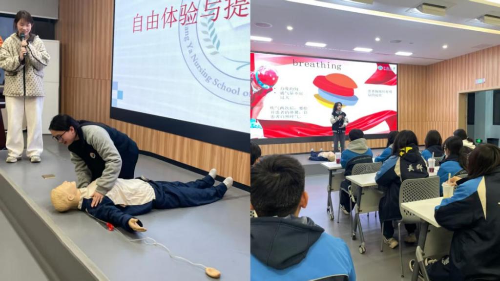 近日,湘雅护理学院学生会志愿活动部走进长郡双语中学及麓山国际中学,为两个班的同学开展以“急救方舟,青春启航”为主题的急救知识科普活动。活动旨在提升中学生急救技能与安全意识,响应“健康中国”行动号召,营造“敢救、会救”的校园氛围。