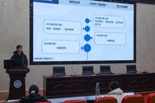 随后,卢靖然学长作为曾成功申报国家级大学生创新创业项目并担任负责人的优秀代表,分享了他的实战经验与体会。他从“什么是大创”“如何高效立项”“大创与‘互联网+’”以及“参与科研训练带来的成长与收获”四个方面展开,语言生动、内容详实,并结合自身从选题到结项的全过程,耐心解答了现场同学提出的各类疑问,增强了大家投身创新创业实践的信心。