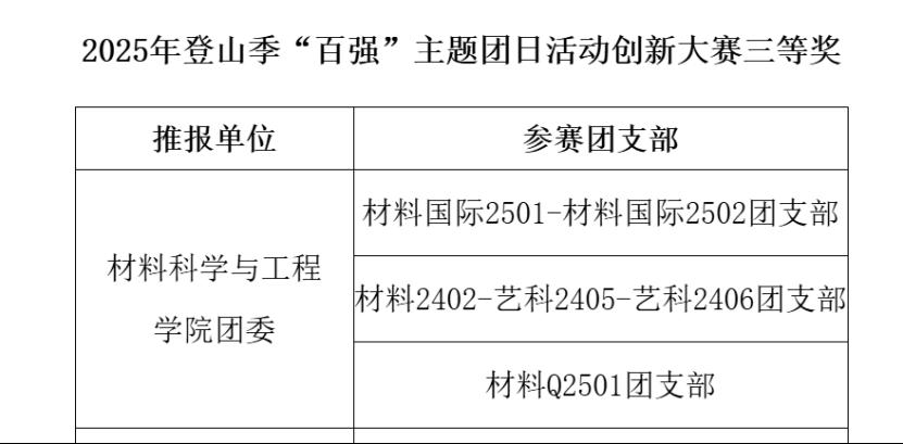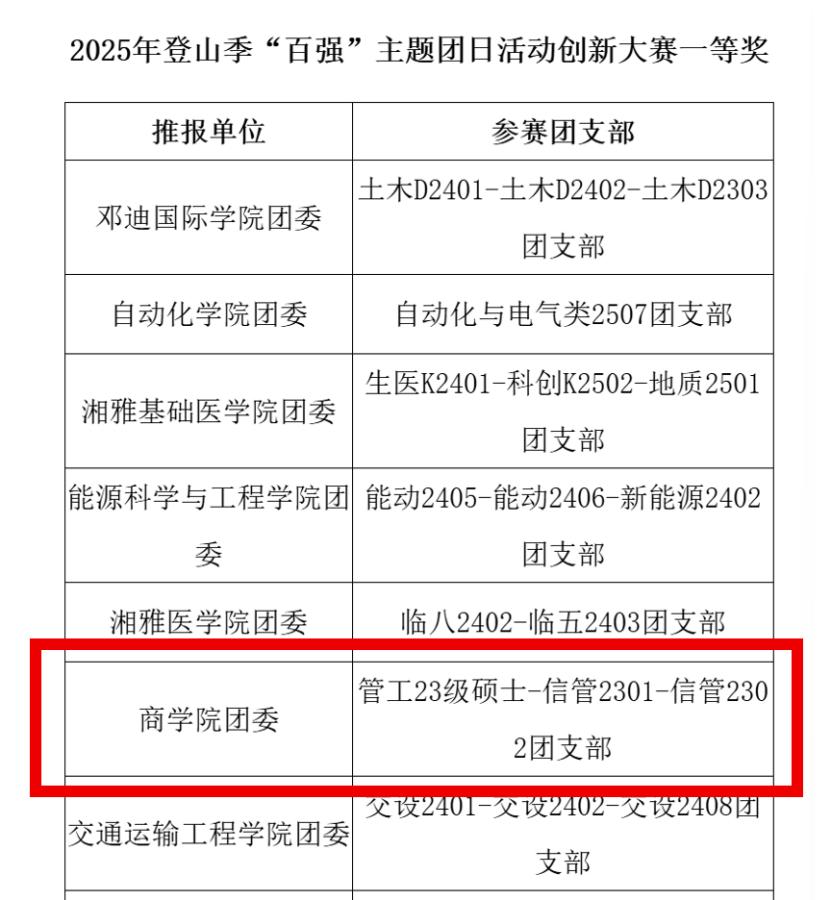 红色足迹锚定青春航向,岳麓攀登赓续信仰力量。登山季“百强”主题团日活动创新大赛的佳绩不仅是对商学院团委育才工作的肯定,更是对各优秀支部牢记历史、创新实践的激励与认可。期待广大商院学予以获奖支部为榜样,用坚实的步履描绘青春画卷,用澎湃的热情擘画建设蓝图,积极投身团日活动与支部建设,为学院与学校的未来发展贡献自己的青春力量。