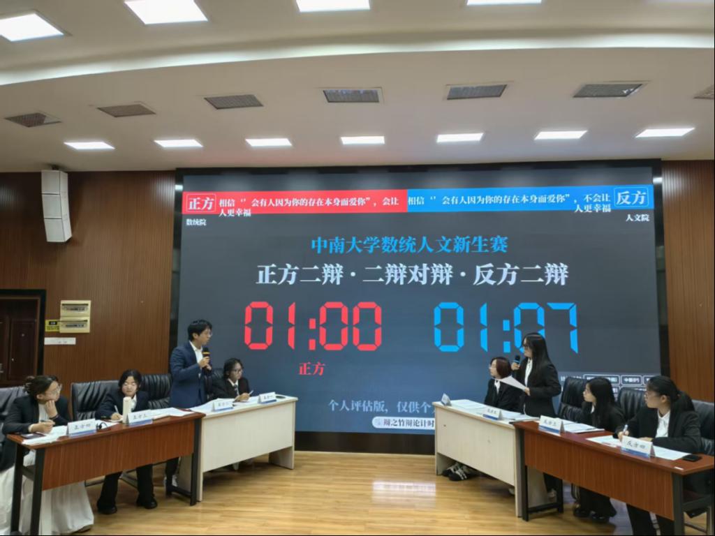 为践行中南大学“知行合一,经世致用”的校训,融通文理精髓,弘扬思辨文化,2025年12月20日,由数学与统计学院与人文学院团委学生会联合举办的新生辩论赛决赛在文法楼222教室顺利举行。