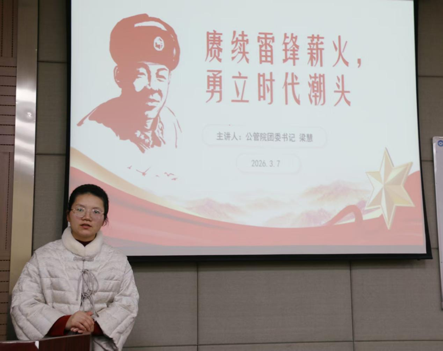 随后,学院团委书记梁慧以“赓续雷锋薪火,勇立时代潮头”为主题讲授团课,深入阐释雷锋精神的时代内涵,号召团支书带领团员积极参与梅岭社区、楠竹社区等志愿服务活动,以实际行动践行青年担当。