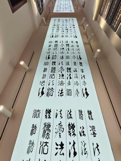 步入长廊,首先映入眼帘的是满壁镌刻着、错落有致铺展开来的各种“法”字。它们以极强的视觉冲击力扑面而来,象征着法治精神在中华大地上蔚然成风的磅礴气象。