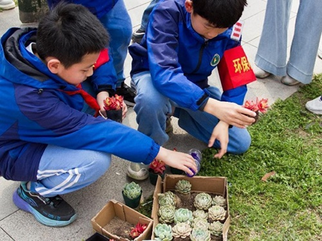 此次活动共栽种山茶花树、八月桂等苗木20余株,完成多肉移植40余盆。活动结束后,志愿者、社区工作人员与小学生们合影留念,定格下这个春日里的绿色约定。