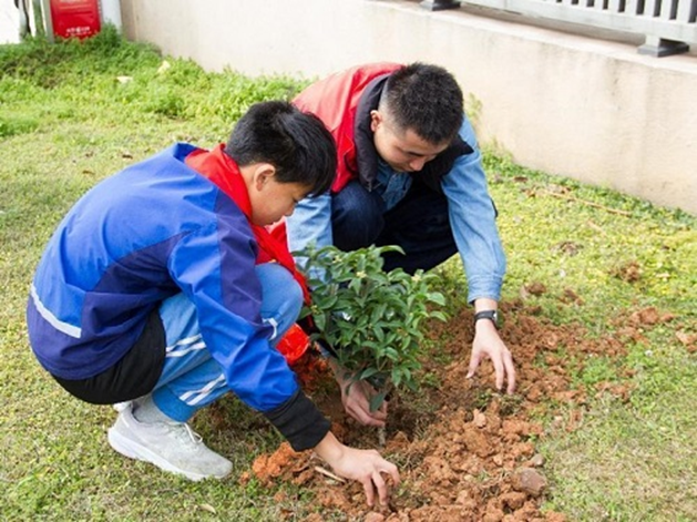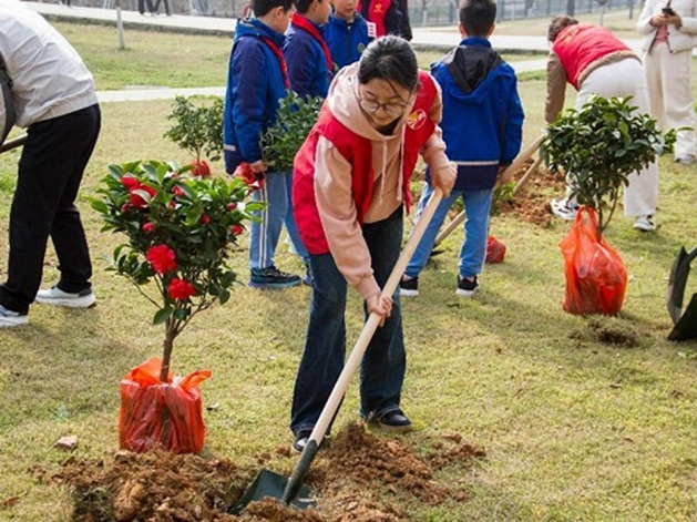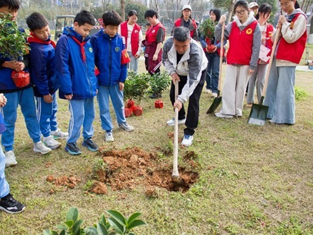 3月12日上午,学院志愿者与湖南师范大学附属高新实验小学的学生代表共同步行前往滨河公园,开展义务植树活动。抵达活动现场后,一行人分两组——植树组和盆栽组,各司其职,配合默契。