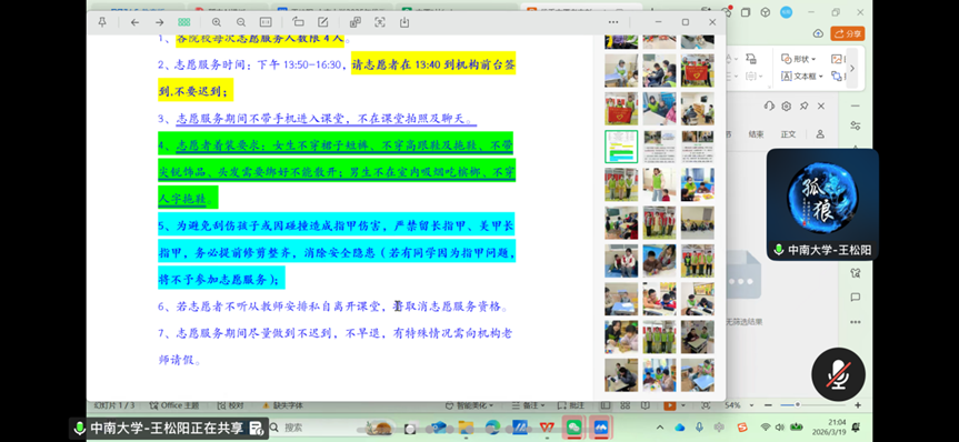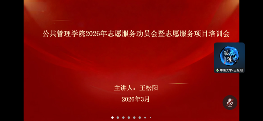 为进一步强化志愿者队伍建设,提升志愿服务专业化水平,2026年3月19日晚,中南大学公共管理学院青年志愿者协会召开线上2026年志愿服务动员会暨项目培训会。学院青年志愿者协会主席王松阳担任主持人并主讲,全体志愿者齐聚云端参会。