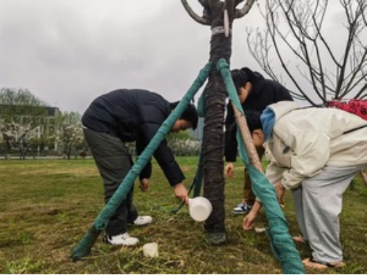 春光明媚,碧草如茵。下午15时,同学们分成两组展开行动。"护绿小分队"携带水桶、水瓢等工具,为潇湘校区树木进行浇灌。同学们仔细清理树坑内的枯枝落叶,松动板结土壤,再缓缓浇灌透水,确保每一株树木都能喝饱"返青水"。