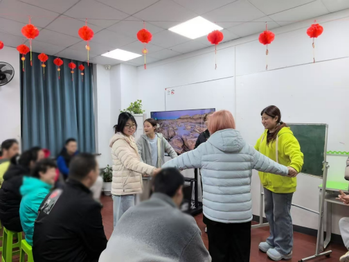 活动伊始,志愿者与学员们手拉手围成圆圈,开始了第一个游戏“吹泡泡”。随着口令变化,大家时而舒展手臂扩大圆圈,时而彼此靠近缩小间距,在简单的肢体互动中迅速拉近了距离,现场气氛轻松活跃。
