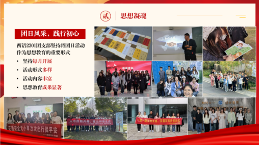 西语 2301 团支部扎实推进支部建设与思想引领工作,常态化开展各类主题团日活动,思想教育成效显著。定期开展季度团课学习,引领团员把握正确思想方向,在学思践悟中彰显青春活力与青年担当。