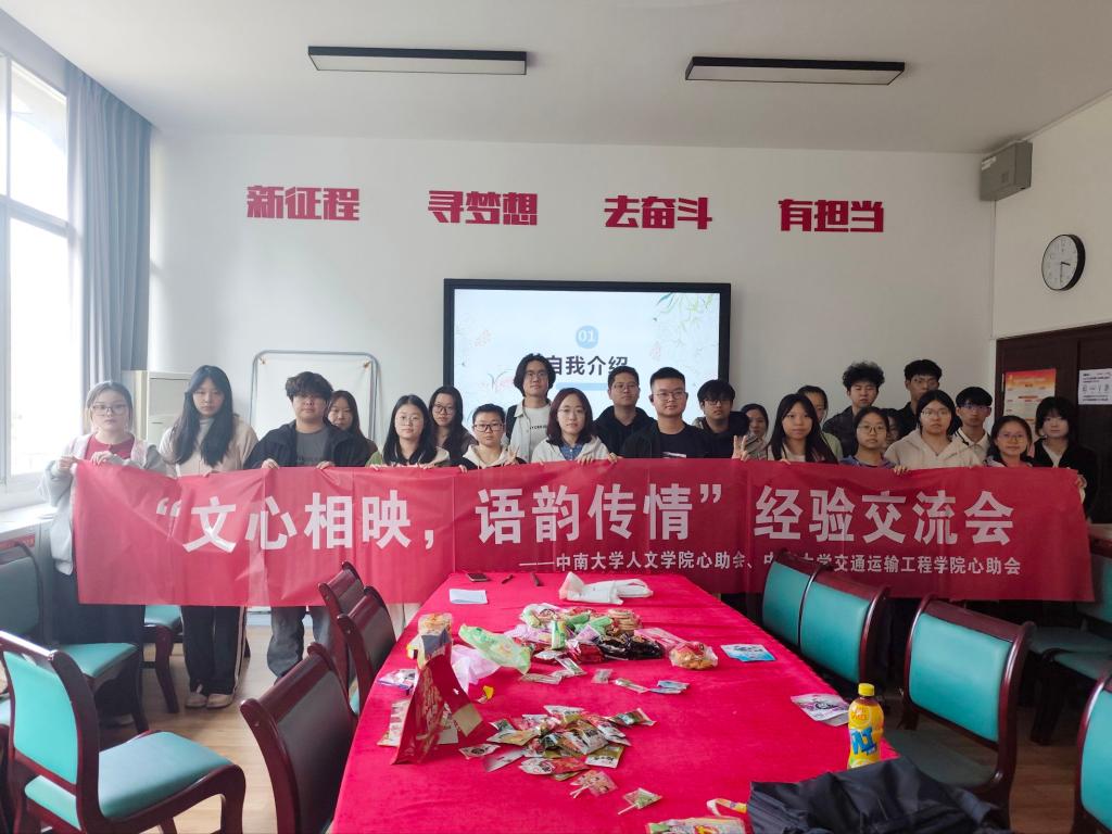 为促进院系交流、拓展工作思路,2026年4月1日14时30分至15时30分,交通运输工程学院朋辈心理互助会与人文学院朋辈心理互助会,在麓南校区文法楼234教室联合举办了“文心相映,语韵传情”主题交流分享会。本次活动面向两院朋辈心理互助会成员,旨在通过互学互鉴、资源共享,为后续共同开展“积极心理体验营”等心理健康教育活动凝聚共识、积蓄力量。