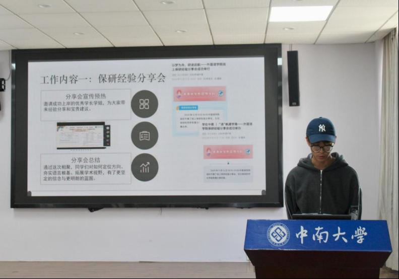学术部陈博文总结了本学年考研经验分享会、语言角等系列活动的开展成效,并规划下一阶段将持续开展开展专四备考、考研经验交流等品牌活动。