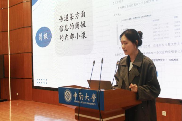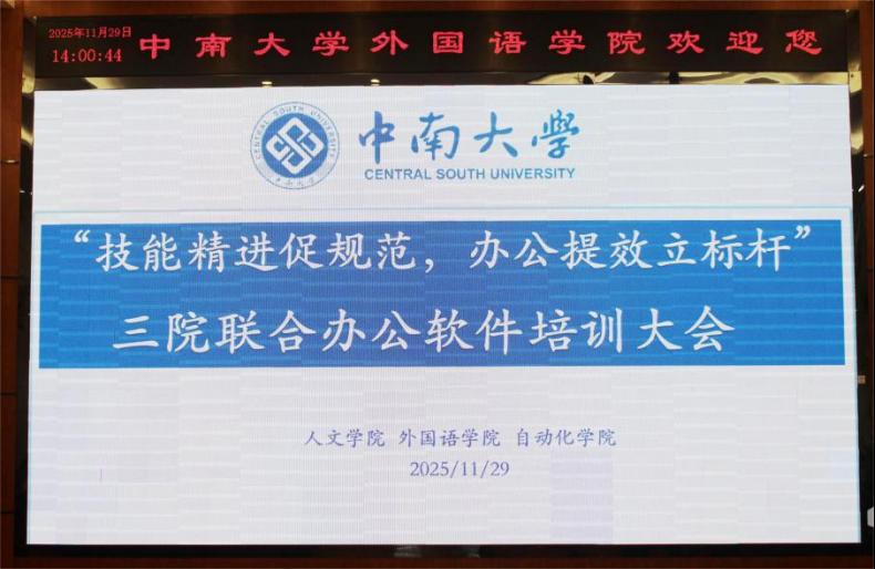 为了使同学们熟练掌握办公软件的使用方法和应用文体的写作要领,从而优化工作流程、提高工作效率,推动日常学习和学生工作更加标准化、规范化,人文学院学生会、自动化学院学生会、外国语学院学生会于2025年11月29日14时在中南大学潇湘校区外语楼国际报告厅联合举办了“技能精进促规范,办公提效立标杆”办公软件培训大会。