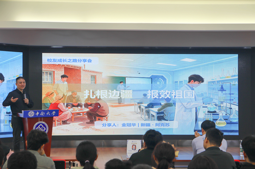 青春逢盛世,奋斗正当时。为发挥优秀校友榜样引领作用,引导中南学子将个人理想融入国家发展大局,2026年4月14日下午,由中南大学党委学生工作部主办、化学化工学院承办的“中南校友说”系列活动,在中南大学毓秀楼411报告厅顺利开展。本次分享会以“扎根边疆·化学报国”为主题,金冠华校友应邀问渠长廊·中南校友说开讲,党委学生工作部副部长宋晓东、化学化工学院党委副书记滕晓雯出席活动,与同学们共话青春担当。