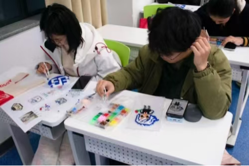 活动伊始,完成签到的同学们领取了内容丰富的拼豆工具包,包括方形模板、五彩拼豆、专用夹子及分格收纳盒等。为帮助零基础同学快速上手,现场还准备了多款简易图纸。参与者或参照图纸,或自由发挥,在模板上细心排列每一颗拼豆。工作人员全程陪伴,随时解答关于排列、配色及图案设计等方面的问题。