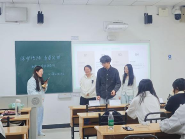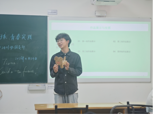 全班分为三组进行“垃圾分类极速挑战”,团支书任裁判,随机报出垃圾名称,参赛同学快速判断并站队。在趣味竞技中,大家巩固垃圾分类知识、锻炼协作,答错小组还创意产出西班牙语环保标语,用专业语言传递环保心声。