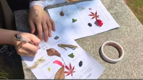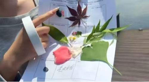 大家带着提前准备好的采集卡,在春日里分头行动,用心寻找清单上的每一份“限定美好”:寻找闻起来甜甜的花草、色彩鲜艳的花瓣、质地坚硬的果实,也捕捉有生命力的叶片、能发出声响的物件,还有那些形状独特的小惊喜。