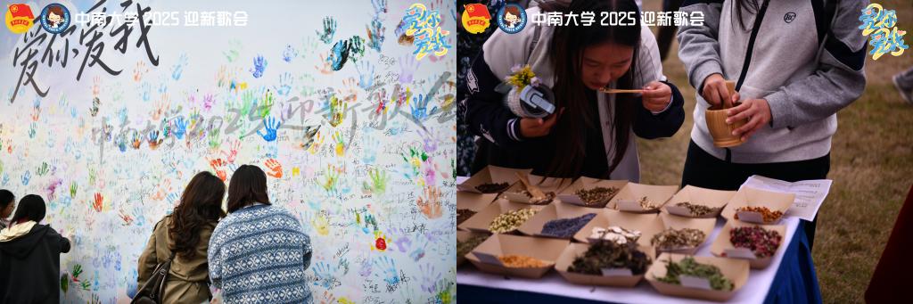 这场名为“爱你爱我”的相遇,远不止于歌声和夜晚。从按下手印的签名墙,到亲手制作的腕间花香;从K歌挑战的纵情欢唱,到笔墨间的青春寄语……温暖与热烈的氛围从下午的游园会就已然开始,新生们在互动中共同编织出独一无二的中南初记忆。