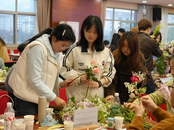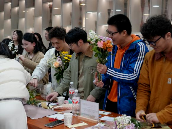 最受大家喜爱的“春日花市”环节更是将气氛推向高潮。大家精心挑选各色鲜花,搭配精致的包装纸与丝带,亲手制作出一束束别致又漂亮的花束。有人将花束赠予刚认识的伙伴,表达初见的欢喜;有人以花换花,交换一份独属于春日的心意,每一束花里都藏着真诚的问候与美好的期许。参与活动的同学们纷纷表示:“这样温馨又有趣的环节太让人喜欢了,真心希望活动能一直办下去”。一字一句的真切反馈,尽显大家对这一环节的喜爱与认可。