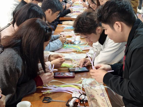 在手作互动环节,同学们共同制作扭扭花束和压花书签,结伴创作、互换心意,在动手过程中施展创意,拉近彼此的距离。在充满创意与暖意的氛围中,大家又依据手中的观点卡组队畅谈,围绕科研、生活、未来等话题各抒己见,开启“春日对话”,相似的观点在此碰撞共鸣。随后,吉他社带来悠扬的弹唱,大家在轻松的氛围中深入交流,现场欢笑与热议不断。